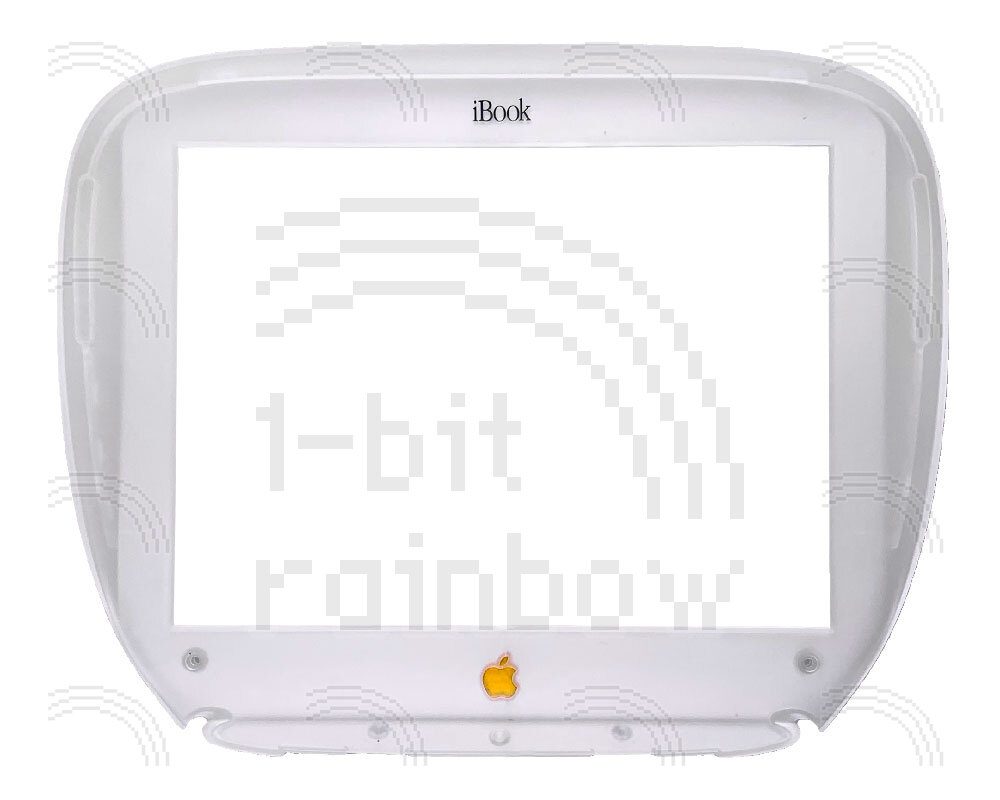 Original Apple Tangerine display bezel and bezel shield for the original models of iBook G3 Clamshell. This A-grade item will have either no cracks or a very tiny crack around the Apple logo.