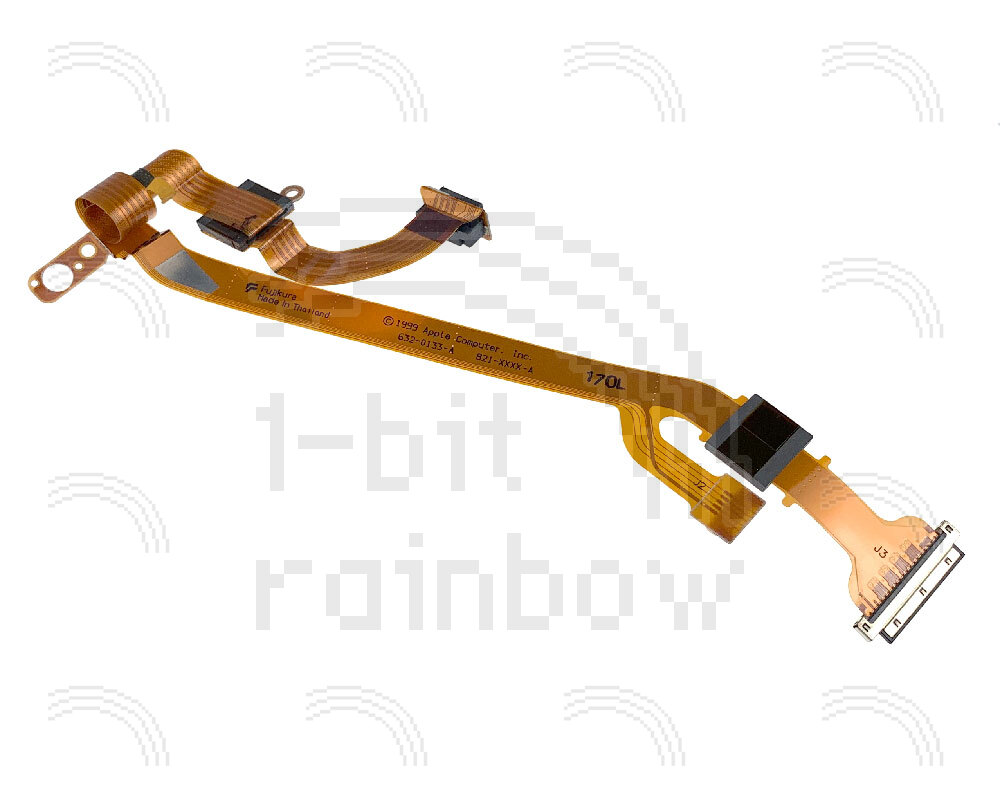 LVDS display data cable for use with Chi Mei Optoelectronics (CMO) LCD panels only on all models of PISMO PowerBook G3. Do not use this cable with an LG or Samsung LCD. This cable carries the display signal from the logic board, through the display hinge to the back of the LCD panel. Damage to this cable can cause the image on the display to corrupt or disappear.