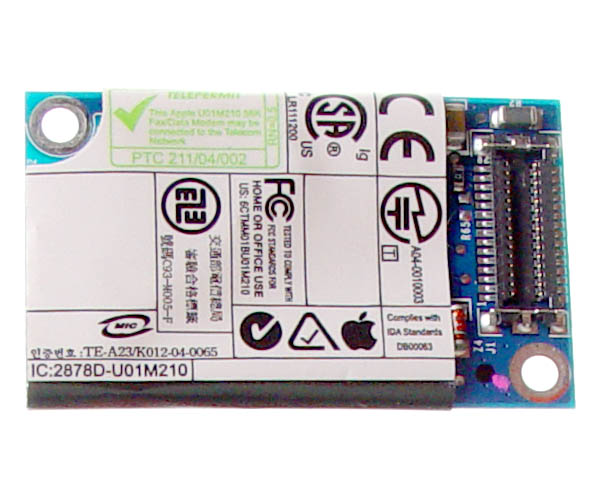 Internal 56K v.92 modem board used in certain models of 15" & 17" Aluminium PowerBook G4. Please note that the model used in some G5 PowerMacs, eMacs, Minis and iBook G4s is very similar and carries exactly the same manufacturers part number but the connector is different and the modems are NOT interchangeable. See compatibility table below. This does not include the modem flex cable or modem socket which can be purchased seperately.