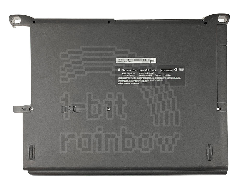 Original Apple bottom case for the PowerBook 5300 series. Includes the reset button actuator, PCMCIA doors, rubber O-ring & eject buttons, and the media bay eject mechanism. Does not include the media bay LED. This is physically interchangeable with the 190 series bottom case but has a range specific label.